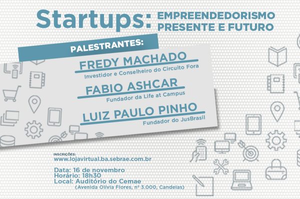 O encontro receberá palestras de Fredy Machado, investidor e conselheiro do Circuito Fora; Fábio Ashcar, fundador da Life at Campus; e Luiz Paulo Pinho, fundador da JusBrasil. As inscrições podem ser feitas por meio do site: www.lojavirtual.ba.sebrae.com.br.
