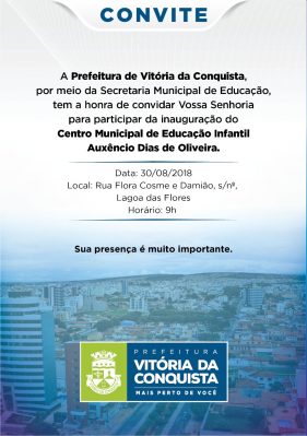 A Prefeitura de Vitória da Conquista vai entregar à comunidade o Centro Municipal de Educação Infantil Auxêncio Dias de Oliveira. O equipamento, localizado na Lagoa das Flores, beneficiará cerca de 120 crianças de dois a cinco anos.