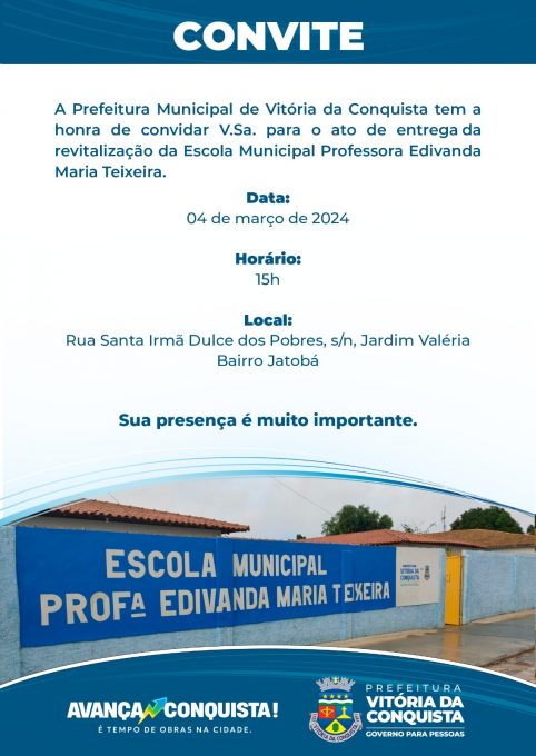 A Prefeitura de Vitória de Conquista (PMVC) entrega à comunidade, nesta segunda-feira (4), às 15h, a Escola Municipal Professora Edivanda Maria Teixeira totalmente revitalizada.