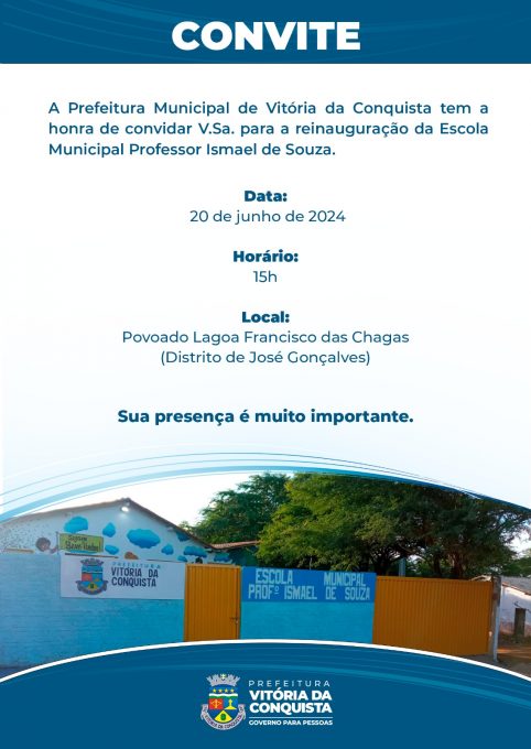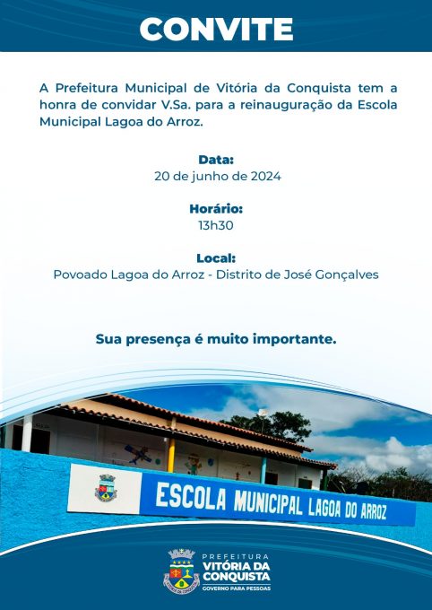 A Prefeitura de Vitória da Conquista entrega à população da Zona Rural, nesta quinta-feira (20), mais duas escolas totalmente revitalizadas. A primeira será a Escola Municipal Lagoa do Arroz, às 13h30. Logo depois, às 15h, a Escola Municipal Professor Ismael de Souza, no Povoado Lagoa Francisco Chagas, ambas no distrito de José Gonçalves.