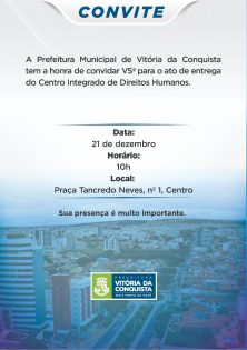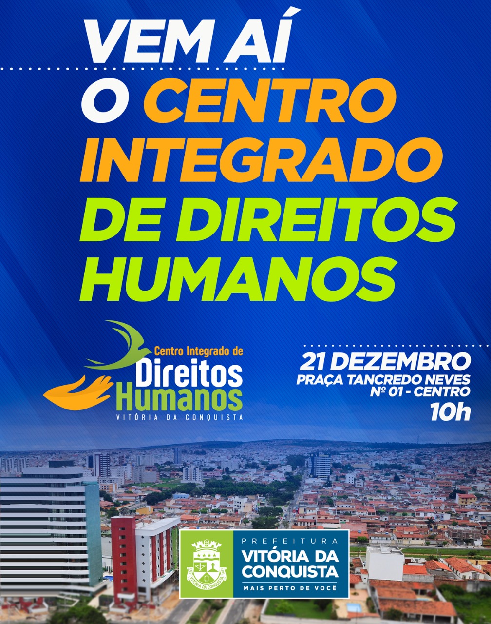 Na próxima sexta-feira (21), a partir das 10h, será inaugurado pela Prefeitura de Vitória da Conquista, o Centro Integrado de Direitos Humanos. Ele vai funcionar na Praça Tancredo Neves, 01, no centro da cidade. No local vão funcionar a Coordenação de Políticas de Promoção da Cidadania e Direitos de Lésbicas, Gays, Bissexuais, Travestis, Transexuais ou Transgêneros (LGBT); a Coordenação de Promoção da Igualdade Racial; Coordenação de Políticas Públicas para as Mulheres; e a Coordenação da Juventude.