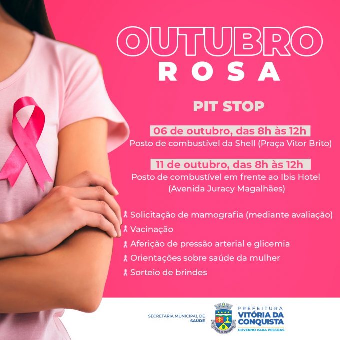 A Campanha Outubro Rosa é realizada em todo Brasil com o objetivo de promover a conscientização sobre o câncer de mama, proporcionar maior acesso aos serviços de diagnóstico e de tratamento e contribuir para a redução da mortalidade. Em Vitória da Conquista, a Secretaria Municipal de Saúde (SMS) vai intensificar as ações de combate à doença. Nesta sexta-feira (5), será realizado o Pit Stop, das 8h às 12h, no posto de combustível da Praça Vitor Brito.