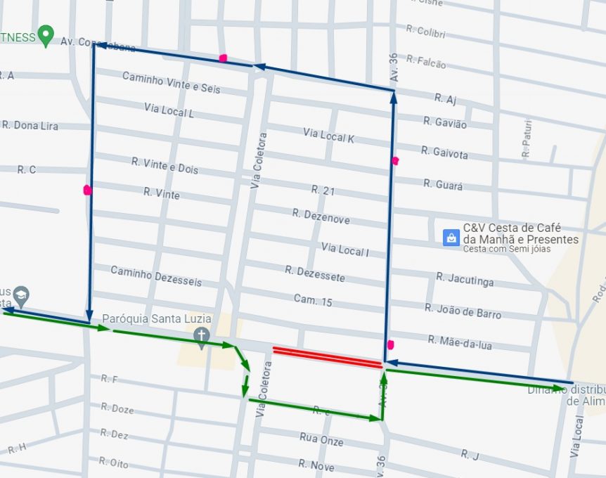 Com a interdição, o trajeto do transporte público também sofre alterações. As linhas D30, P50, P54, R01 e R06 (em azul no mapa), sentido Urbis V, subirão a Avenida 36, convergindo à esquerda na Avenida Copacabana, e retorna ao seu itinerário original pela Rua Corcovado. Os veículos não descerão pela Via Coletora. No mapa, os pontos rosas são as paradas de ônibus e, a linha vermelha, é o trecho interditado. Sinalizado pela linha verde, o trajeto Centro não sofreu alterações.