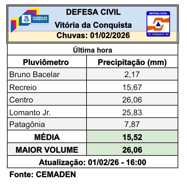 De acordo com os dados do Centro Nacional de Monitoramento e Alertas de Desastres Naturais (Cemaden), as regiões com maior registro de precipitação são o bairro Centro e o Lomanto Júnior, com 26,06 mm/h e 25,83 mm/h, respectivamente.