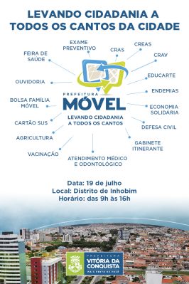 Nesta sexta-feira (20) a Administração Municipal vai estar bem mais perto dos moradores de Inhobim, a 57 km do perímetro urbano de Vitória da Conquista. A Prefeitura Móvel Rural é realizada das 9h às 16 h, na Escola Municipal Paulo Setúbal.