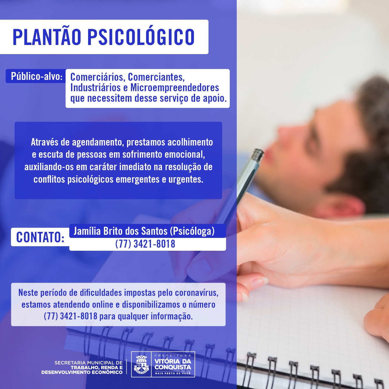 Ciente da situação atual que todos os setores enfrentam e considerando as necessidades que as pessoas que trabalham no comércio e indústria possuem neste momento desafiador, a Secretaria Municipal do Trabalho, Renda e Desenvolvimento Econômico dispõe de Atendimento Psicológico online.