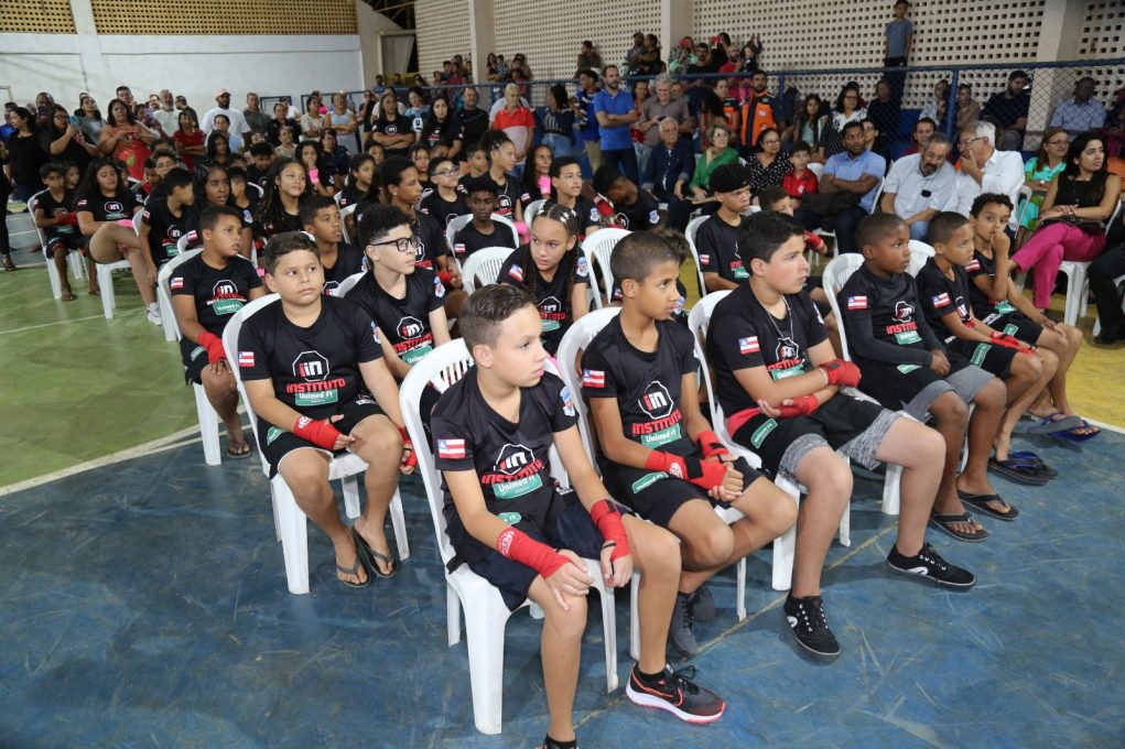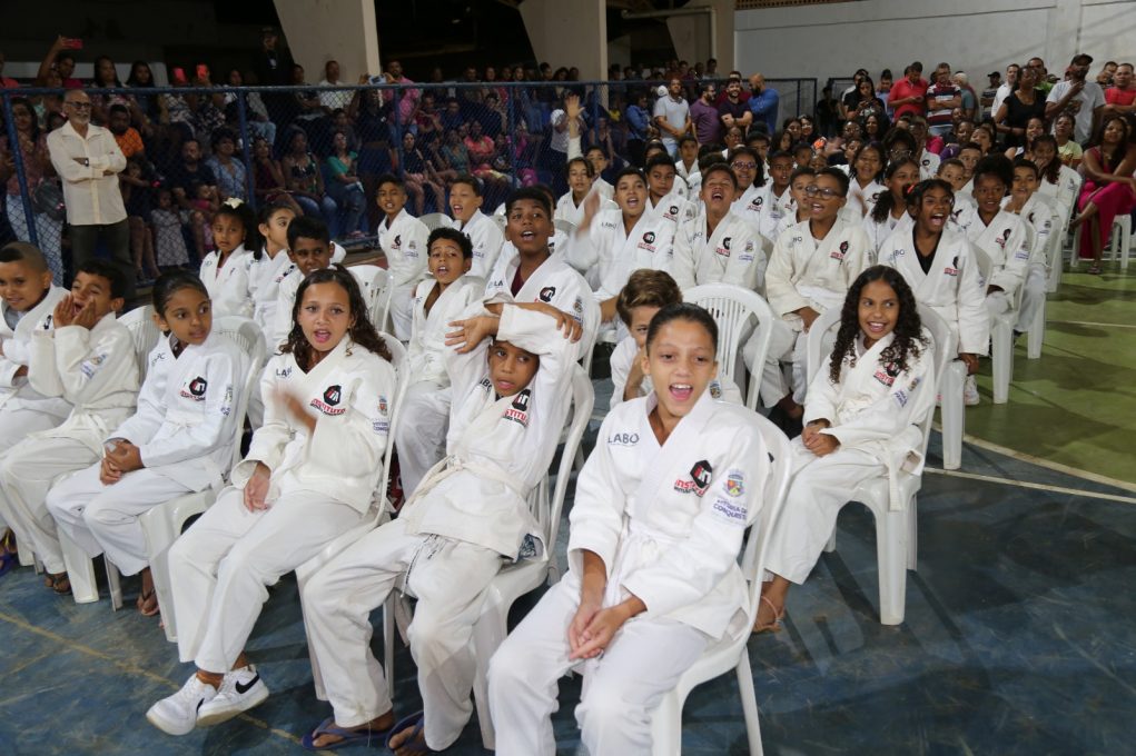 A cerimônia de graduação dos alunos da primeira turma do projeto Irmãos Nogueira “Esporte para Além das Fronteiras” aconteceu na noite dessa terça-feira (19), na quadra da Escola Municipal Lycia Pedral, no bairro Panorama. O evento contou com a presença da prefeita Sheila Lemos, autoridades do legislativo e representantes do governo municipal, que se uniram ao realizador, Rogério Minotouro, para prestigiar os jovens atletas pelo empenho e dedicação.