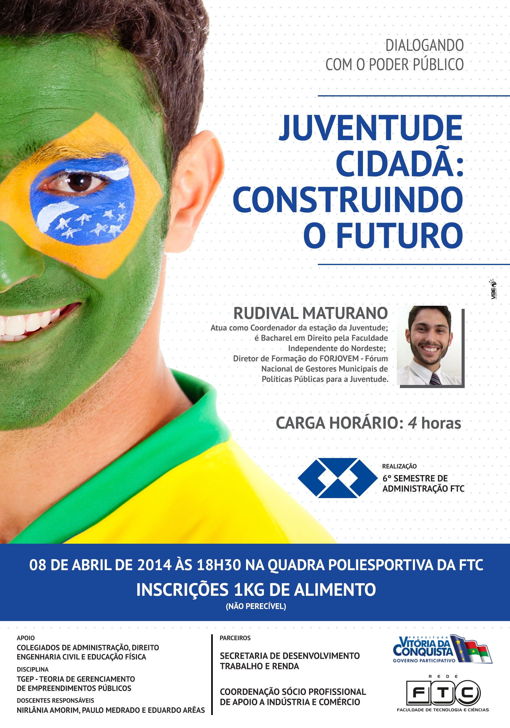 “Dialogando com o poder público” é um evento realizado pela Faculdade de Tecnologia e Ciências (FTC), em parceria com a Prefeitura de Vitória da Conquista, que acontece nessa terça-feira, 8. Essa quarta edição traz como tema “Juventude cidadã: construindo o futuro”. A atividade terá início às 18h30, na quadra poliesportiva da instituição educacional. Haverá, inicialmente, uma palestra com o coordenador municipal de Juventude, Rudival Maturano. Em seguida, terão início as discussões das mesas temáticas a respeito de temas como lazer, esporte, cultura e manifestações populares. A programação prevê ainda um momento de recreação com a “dança sagrada”.
