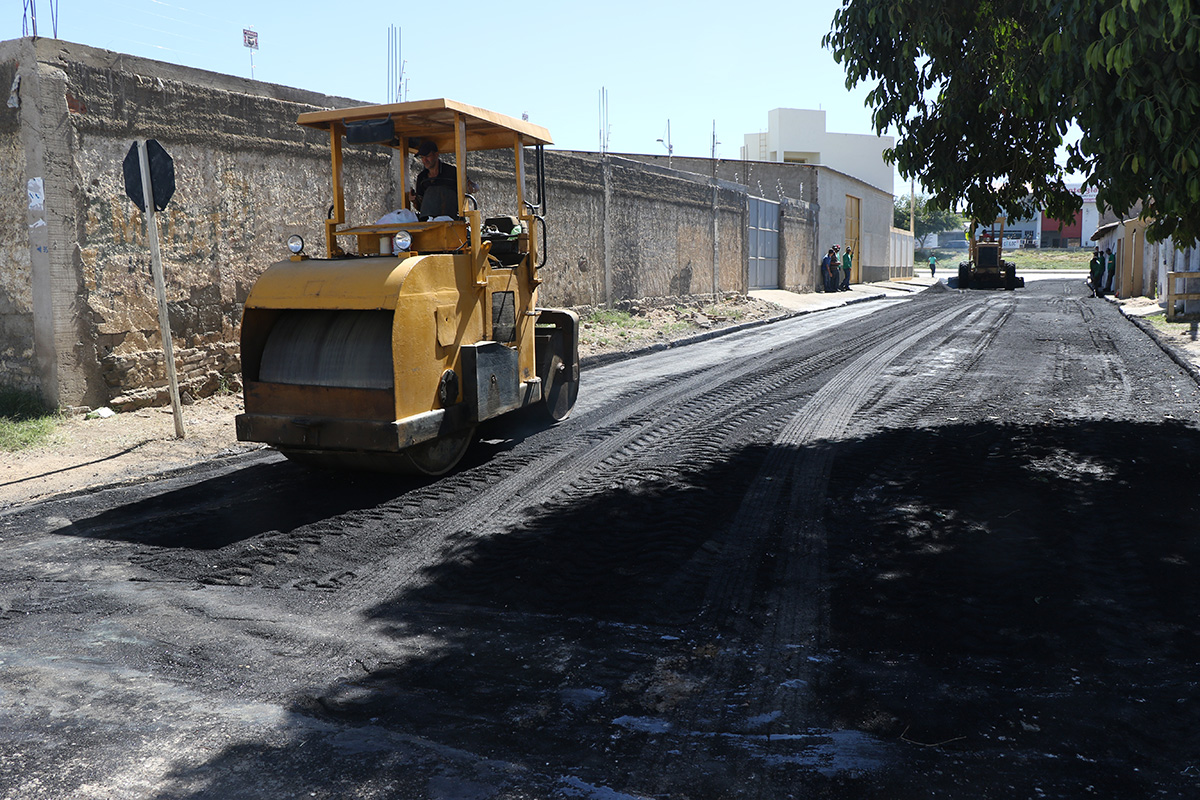 Aí, entram em cena os servidores e máquinas da Empresa Municipal de Urbanização (Emurc), também executando uma ação em dois atos: primeiro, a aplicação de uma camada de asfalto para nivelar e equilibrar o calçamento irregular da via; e, logo depois, com a passagem da última camada, finalizando o serviço.
