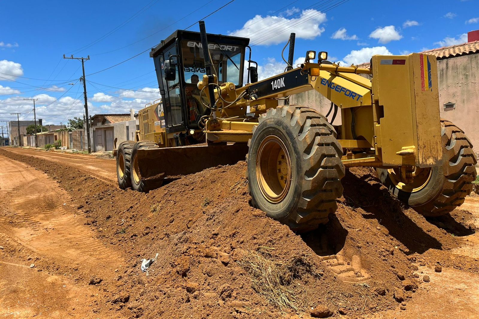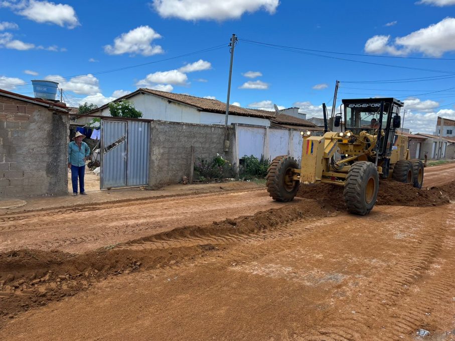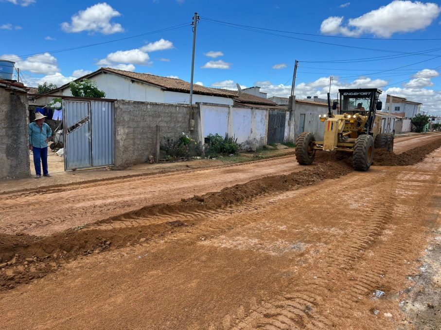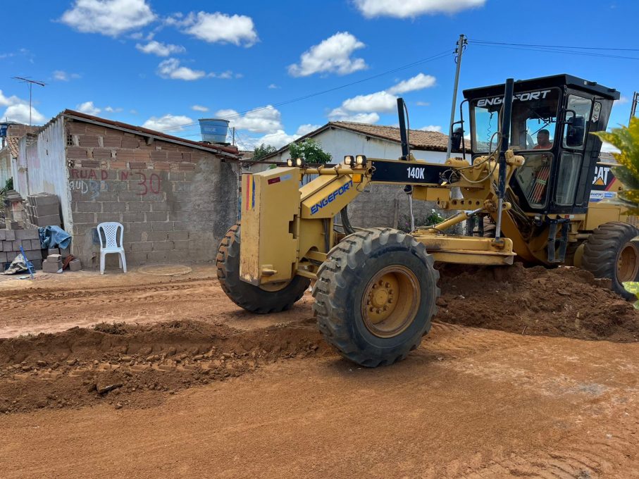 Máquinas e funcionários da Companhia de Desenvolvimento dos Vales do São Francisco e do Parnaíba (Codevasf) trabalham no loteamento Jardim Valéria, nesta segunda-feira (27). Enquanto uma equipe prepara a Rua B para aplicação do asfalto, outra faz o nivelamento da Rua D.
