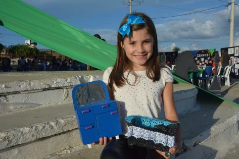 Aluna do Educarte, Ayla Venturine de 8 anos, foi uma das crianças participantes da oficina de material reciclável. Ela mostra com satisfação o resultado de duas peças produzidas por ela, feitas a partir de uma caixa de leite, pedaços de tecido, tinta e espuma. A estudante ressaltou a importância da experiência que o projeto tem lhe proporcionado. “Eu vim para aprender a produzir meus brinquedos, pois sou uma criança que gosta muito de brincar. Eu aprendi a fazer muitas coisas e amo o projeto Educarte”, ressalta Ayla.