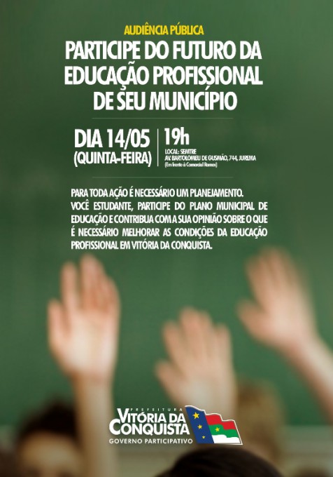 Nessa quinta-feira, 14, a Prefeitura de Vitória da Conquista, por meio da Secretaria Municipal de Educação, vai realizar audiência pública para debater a Educação Profissional em Vitória da Conquista. O evento será realizado na Secretaria Municipal de Trabalho, Renda e Desenvolvimento Econômico (Semtre), às 19h, e contará com a participação de jovens estudantes.