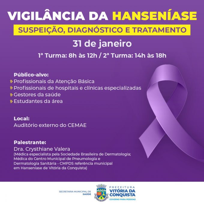 Buscando sensibilizar o olhar do profissional de saúde para a hanseníase, no dia 31 de janeiro, será realizada a capacitação “Vigilância da Hanseníase: Suspeição, diagnóstico e tratamento”, no Auditório Lúcia Maria Dórea, no Complexo de Saúde (Cemae).