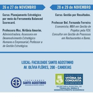 O evento acontece de 26 a 29 de novembro, das 08h às 12h, na Faculdade Santo Agostinho, situada na Av Olívia Flores, 200, bairro Candeias.