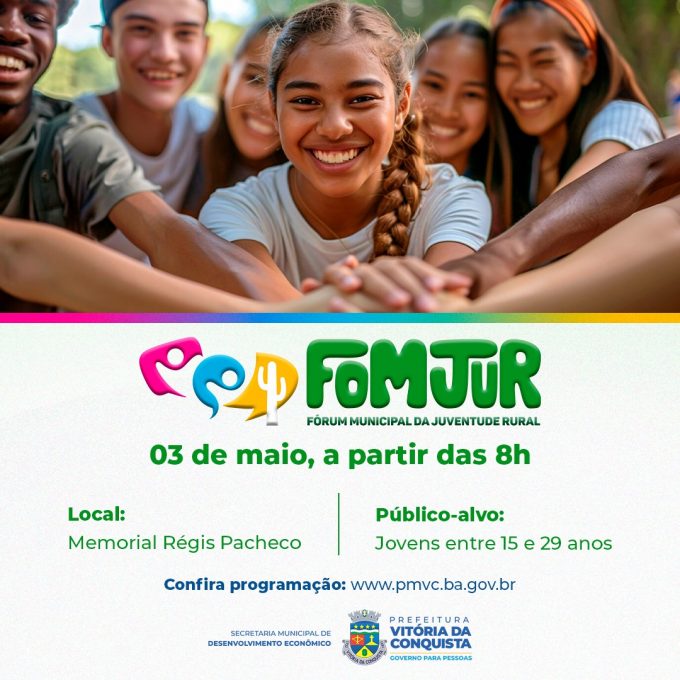 A Prefeitura de Vitória da Conquista promove nesta sexta-feira (3), por meio da Coordenação da Juventude, ligada à Secretaria Municipal de Desenvolvimento Econômico, o Fórum Municipal da Juventude Rural (Fomjur). A ação será realizada na Casa Memorial Governador Régis Pacheco e tem o objetivo de proporcionar um espaço de diálogo e participação ativa na construção de políticas públicas do Município. O credenciamento estará aberto das 8h às 10h.