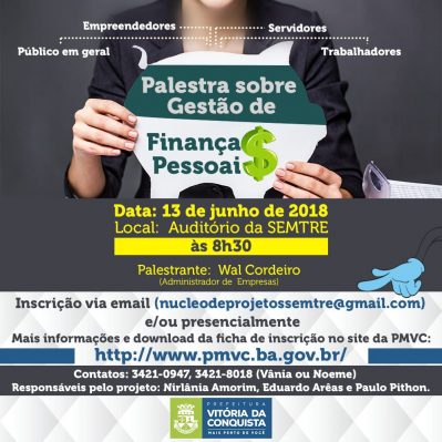 A palestra é direcionada para empreendedores, servidores, trabalhadores e quem mais se interessar sobre orçamento familiar. As inscrições podem ser realizadas no Núcleo de Projetos da Semtre, de segunda-feira a sexta-feira, das 8h às 12h, ou pelo email:nucleodeprojetossemtre@gmail.com, mediante o preenchimento da ficha de inscrição disponívelaqui.