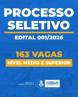 A Prefeitura de Vitória da Conquista publicou no Diário Oficial do Município desta sexta-feira (9), o edital do Processo Seletivo nº 001/2026 que prevê o preenchimento de 163 vagas, além da formação de cadastro de reserva, para atuação na Secretaria Municipal de Desenvolvimento Social (Semdes).