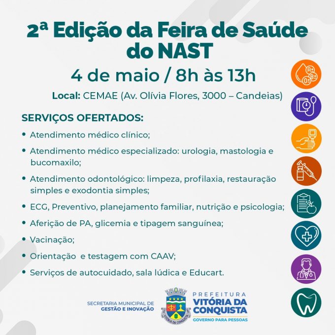 Atenção, servidor! No próximo sábado (4), a Prefeitura de Vitória da Conquista, por meio da Secretaria de Gestão e Inovação (Semgi) realiza a segunda edição da Feira de Saúde do Nast (Núcleo de Atenção à Saúde e Segurança do Trabalho).