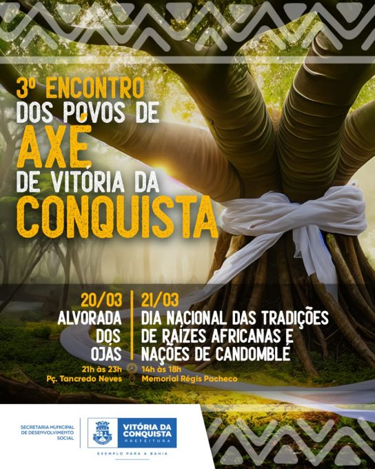 A Prefeitura de Vitória da Conquista, por meio da Secretaria Municipal de Desenvolvimento Social (Semdes), promove nesta sexta-feira (21), o 3º Encontro dos Povos de Axé. O evento será realizado no Memorial Régis Pacheco, das 14h às 18h, em comemoração ao Dia Nacional das Tradições de Raízes Africanas e Nações do Candomblé, celebrado na mesma data.