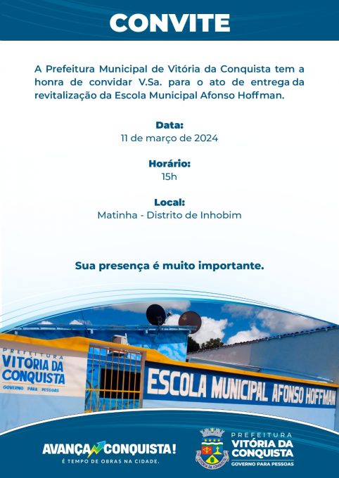 A Prefeitura Municipal de Vitória da Conquista (PMVC) realiza nesta segunda-feira (11), às 15h, a cerimônia oficial de entrega da Escola Municipal Afonso Hoffman, totalmente revitalizada. A reforma aconteceu em algumas etapas, sendo iniciada e finalizada em 2023. O valor do investimento foi de R$ 160.767,52.