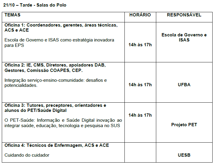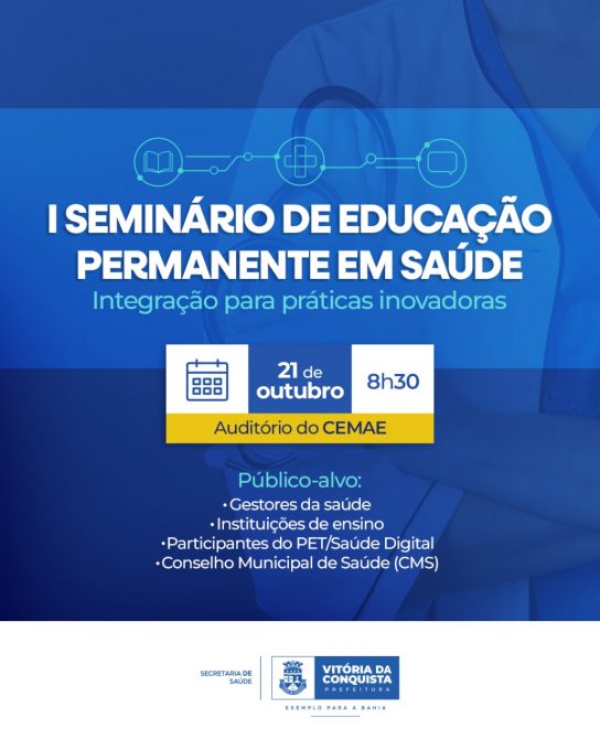 A Prefeitura de Vitória da Conquista, por meio da Secretaria Municipal de Saúde, realiza o I Seminário de Educação Permanente em Saúde: “Integração para Políticas Inovadoras”, na próxima terça-feira (21), das 8h30 às 17h, em parceria com o Programa de Educação pelo Trabalho para a Saúde (PET/Saúde/Digital), Universidade Federal da Bahia (Ufba), Universidade Estadual da Bahia (Uesb) e Instituto Federal da Bahia (Ifba).