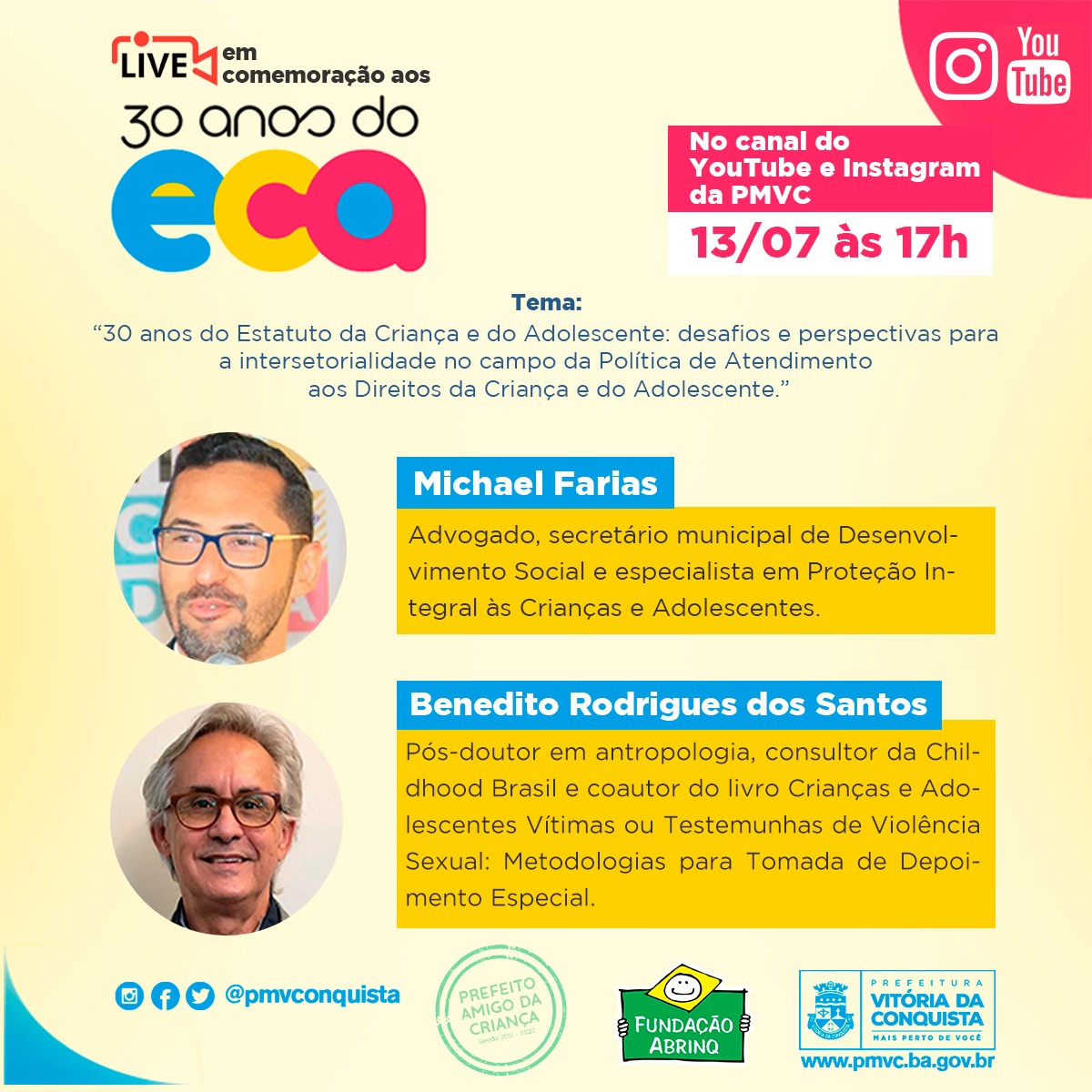 No dia 13 de julho, o Estatuto da Criança e do Adolescente (ECA) completa 30 anos. Para celebrar esse importante marco, a Prefeitura Municipal de Vitória da Conquista irá realizar uma live com o tema “30 anos do Estatuto da Criança e do Adolescente: desafios e perspectivas para a intersetorialidade no campo da Política de Atendimento aos Direitos da Criança e do Adolescente”.