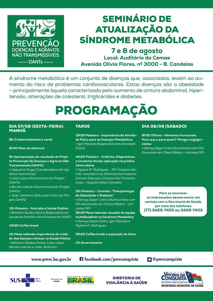 Como parte das atividades do projeto “Prevenção Doenças e Agravos Não Transmissíveis”(DANTS), que está completando um ano de atividade, a Prefeitura de Vitória da Conquista realizará nos dias 7 e 8 de agosto, no auditório do Cemae, um Seminário de Atualização da Síndrome Metabólica.