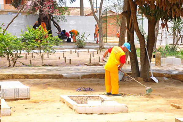 Manutenção em cemitérios – Os cemitérios do bairro Kadija e da Saudade também receberam uma série de intervenções. O primeiro recebeu um mutirão de limpeza em toda a sua extensão, com capina, varreção, recolhimento de entulho e pintura nos muros e meios-fios.