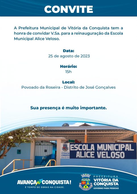 A Prefeitura de Vitória da Conquista reinaugura nesta sexta-feira, 25, às 15h, a Escola Municipal Alice Veloso, localizada no Povoado da Roseira, distrito de José Gonçalves. A reforma aconteceu em etapas, desde a ampliação, até a finalização em 2023, quando teve o grande avanço com a cobertura. O valor investido foi de R$ 109.000,00.