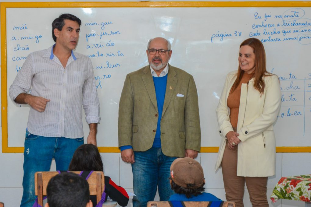 O diretor Alexandre Botelho, o secretário Larry e a prefeita Sheila conversam com alunos do 3º ano