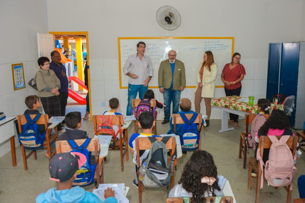 O diretor Alexandre Botelho, o secretário Larry e a prefeita Sheila conversam com alunos do 3º ano