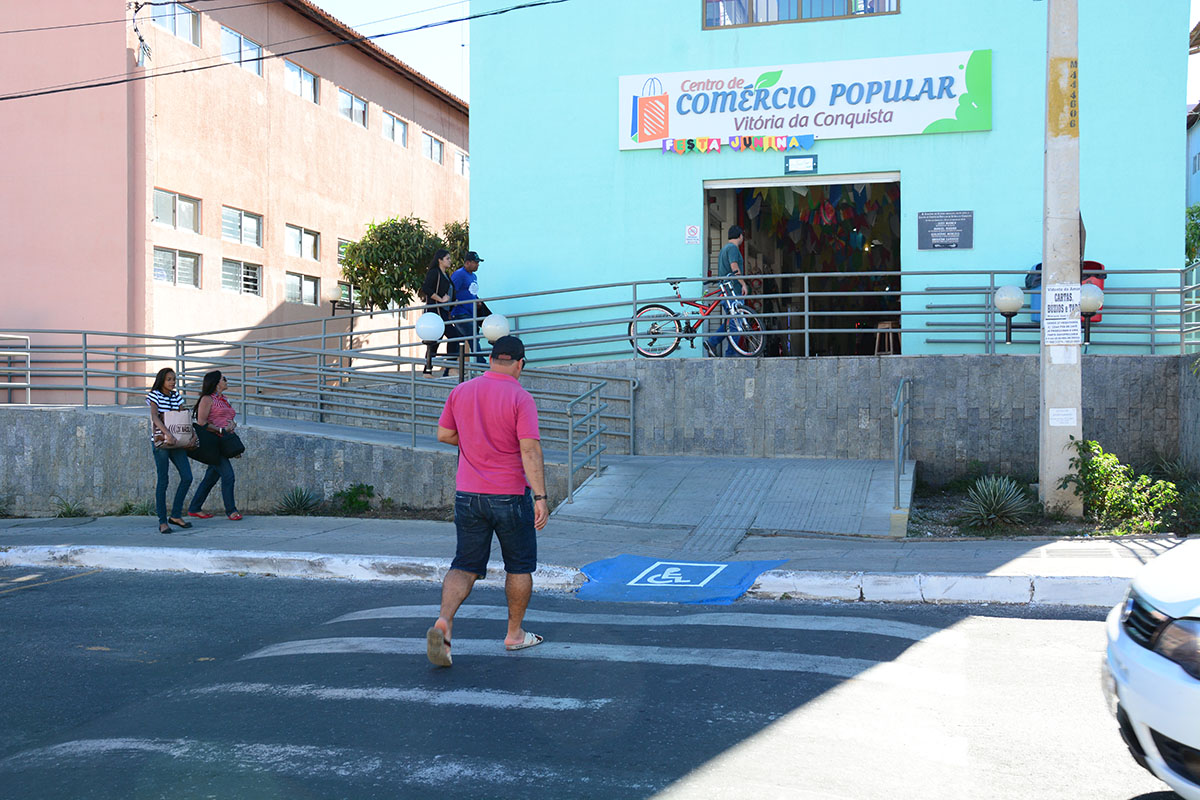 Formado por três módulos, nos quais funcionam 302 boxes, o Centro de Comércio Popular de Vitória da Conquista possui, nas calçadas de seu entorno, oito rampas de acesso a cadeirantes, além das que foram construídas na área interna.