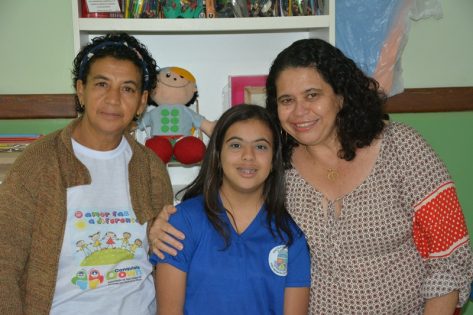 Maria Vitória entre a mãe, Jacira (à esquerda), e a professora Dilma (à direita).