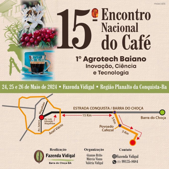 Será realizado de 24 a 26 de maio, no município vizinho de Barra do Choça, o tradicional Encontro Nacional do Café. O evento, que este ano está na 15ª edição, é promovido pela Fazenda Vidigal e conta com o apoio da Prefeitura de Vitória da Conquista. Na ocasião também será realizado o 1º Agrotech Baiano: Inovação, Ciência e Tecnologia.