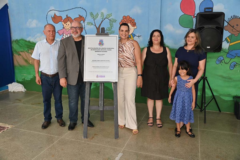 Na tarde desta segunda-feira (16), foi realizada a entrega da 89ª unidade escolar revitalizada pela Prefeitura de Vitória da Conquista. O Centro Municipal de Educação Infantil (Cmei) Padre Benedito Soares, localizado no bairro Guarani, passou por uma reforma completa em suas instalações, com um investimento de R$ 224.737,30. O evento contou com a presença de alunos, pais, professores, servidores do Cmei e autoridades, incluindo a prefeita Sheila Lemos, o presidente da Câmara Municipal, Hermínio Oliveira, e o secretário municipal de Educação, Edgard Larry.