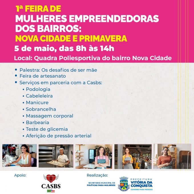 Neste domingo (5), acontece a primeira Feira de Mulheres Empreendedoras dos Bairros, das 8h às 14h, contemplando as localidades Nova Cidade e Primavera. O evento, que será realizado na Quadra Poliesportiva do Nova Cidade, é promovido pela Prefeitura, por meio da Secretaria Municipal de Políticas para Mulheres, e conta com o apoio da Comunidade de Assistência Social Beleza e Saúde (Casbs).