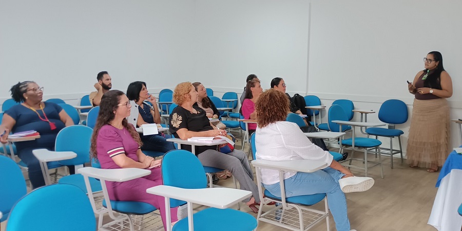 Profissionais ligados à modalidade Educação de Jovens e Adultos (EJA), de Vitória da Conquista, participam de formação promovida pela Coordenação da EJA do Núcleo Pedagógico em parceria com a Saber Soluções Educacionais – organização especializada em educação pública. A ação se baseou no estudo da obra “Saberes da Vida, Saberes da Escola”, coleção que aborda conteúdos descritos nos anos finais do Ensino Fundamental dos componentes curriculares de Língua Portuguesa, Matemática, Ciências, História, Geografia, Língua Estrangeira Moderna (Inglês e Espanhol) e Arte. O evento teve início na terça-feira (8) e seguiu até quinta-feira (10), na Faculdade Unex.