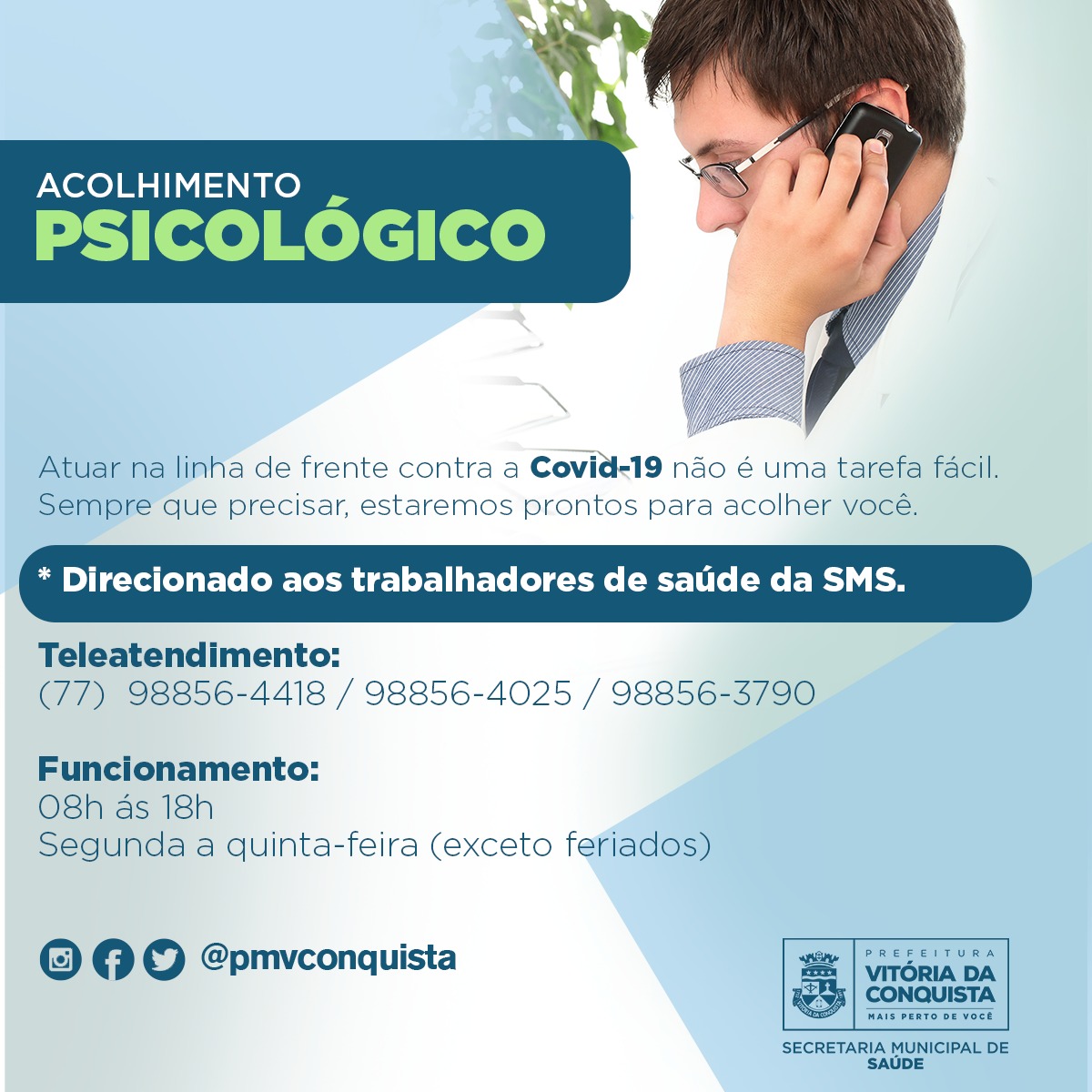 Por isso, estão sendo disponibilizadas linhas de telefone para teleatendimento psicológico para trabalhadores de saúde vinculados à Secretaria Municipal de Saúde que estão atuando no atendimento direto ou indireto à população. Neste momento, esses profissionais vivenciam uma vulnerabilidade aumentada para o estresse, em razão das próprias características de suas profissões e ambiente de trabalho, necessitando assim, de suporte psicológico.