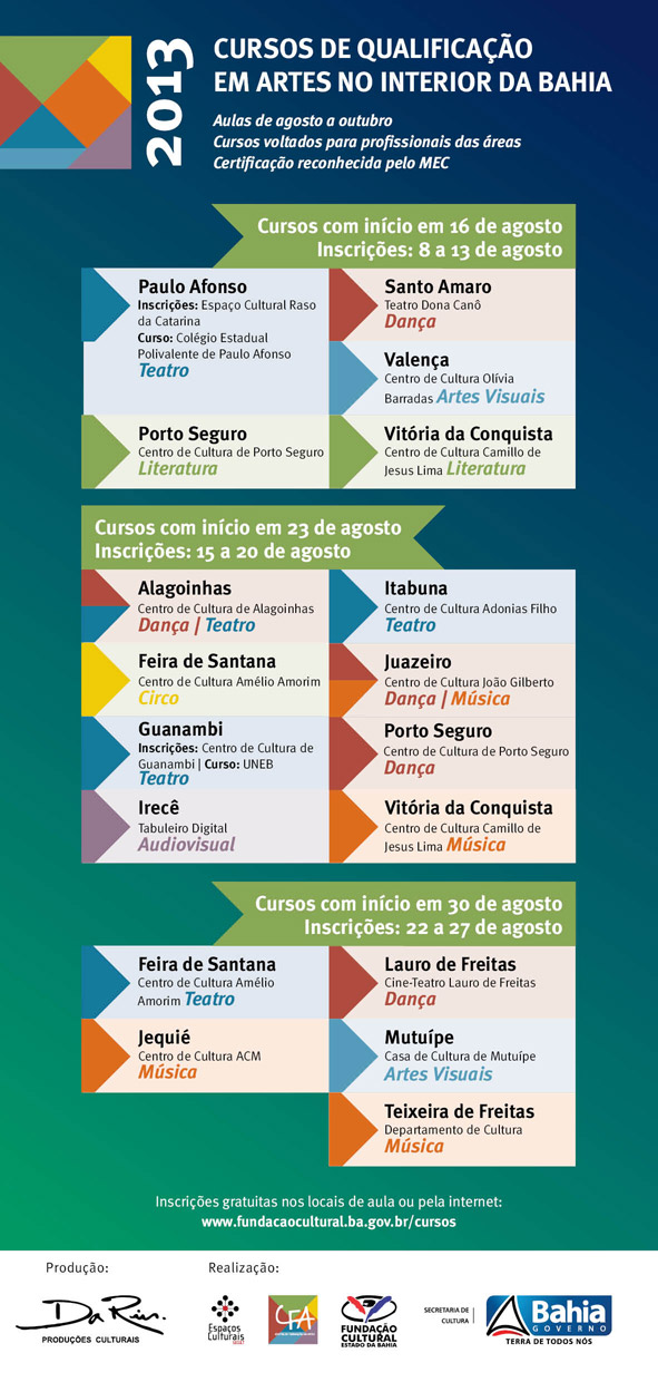 O Centro de Formação em Artes (CFA), da Fundação Cultural do Estado da Bahia (FUNCEB), entidade vinculada à Secretaria de Cultura do Governo do Estado (SecultBA), e a Superintendência de Desenvolvimento Territorial da Cultura (Sudecult), por meio de sua Diretoria de Espaços Culturais (DEC), iniciam o Programa de Qualificação em Artes 2013, que alcançará 15 municípios de diferentes territórios de identidade da Bahia.