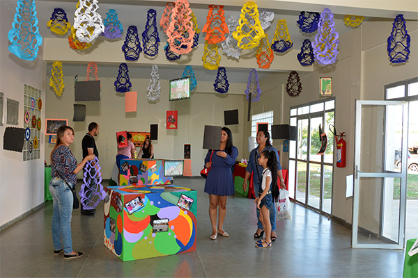 Havia ali dois ambientes: ao entrar, ainda no foyer, o visitante podia apreciar uma exposição de artes visuais, em que figuravam obras feitas por meio de técnicas como pontilhismo, recorte e colagem, além de mandalas de papel, mosaicos, releituras de obras de arte já conhecidas e jogos pedagógicos produzidos pelos monitores e utilizados no trabalho com os alunos nas escolas municipais.