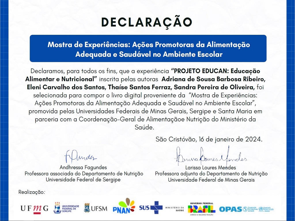 Em janeiro de 2024, o Projeto Educan foi contemplado com a declaração de que irá compor o livro digital proveniente da “Mostra de Experiências: Ações Promotoras da Alimentação Adequada e Saudável no Ambiente Escolar”, promovido pelas universidades federais de Minas Gerais (UFMG), Sergipe (UFS) e Santa Maria (UFSM), em parceria com a Coordenação-Geral de Alimentação e Nutrição do Ministério da Saúde. Foram escolhidas 25 experiências de todo o país, cinco por cada macrorregião e o Projeto Educan de Vitória da Conquista está entre as cinco do Nordeste.