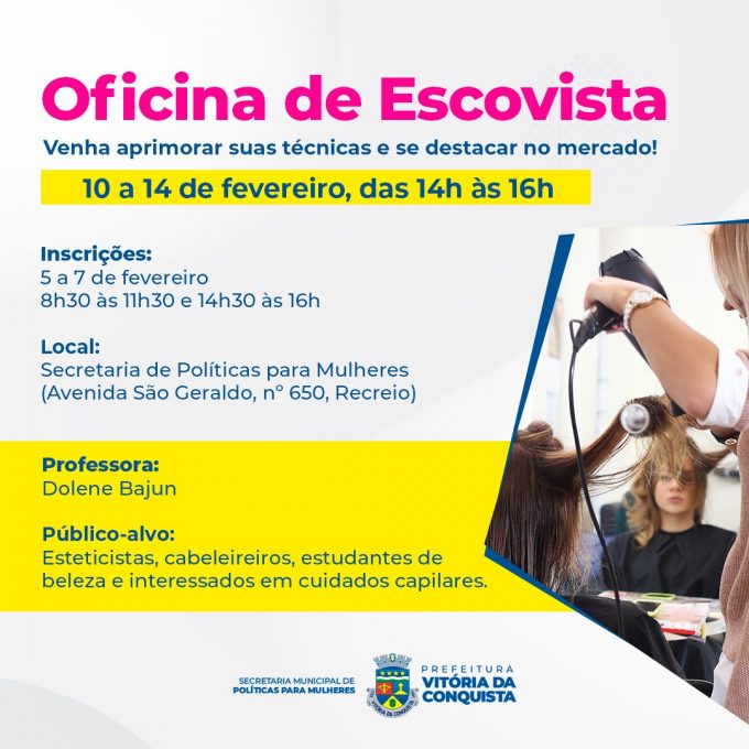 O projeto Mãos e Fios, promovido pela Secretaria Municipal de Política para Mulheres (SMPM), por meio da Coordenação de Autonomia, realiza neste mês de fevereiro, uma Oficina de Escovista. As inscrições para atender esteticistas, cabeleireiras e demais interessadas em cuidados capilares estão abertas até esta sexta-feira (7).