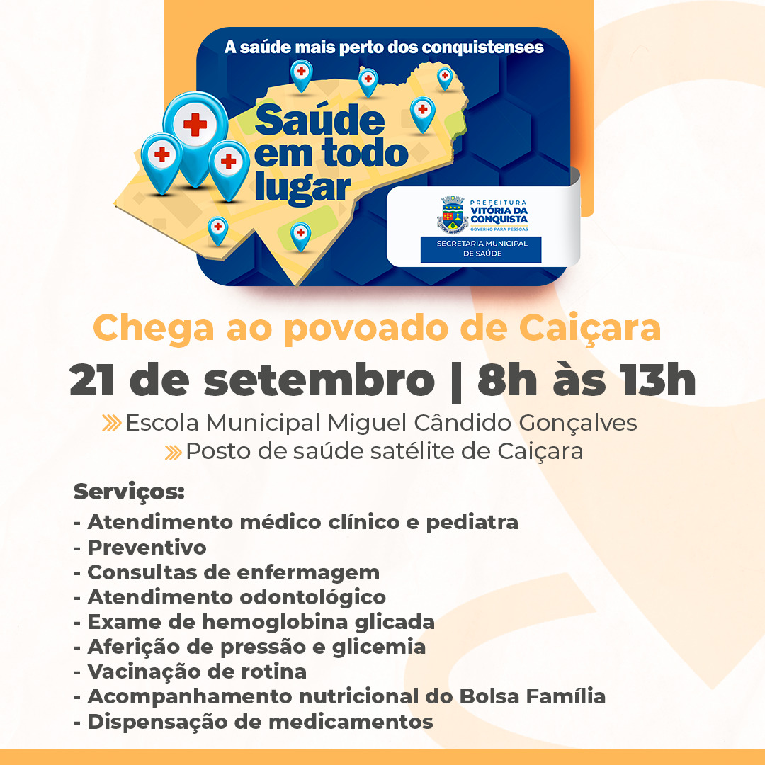 Mais uma ação do projeto Saúde em Todo Lugar, realizado pela Secretaria Municipal de Saúde (SMS), chega, nesta terça-feira (21), ao povoado de Caiçara, no distrito sede do município. A atividade será das 8h às 13h, na Escola Municipal Miguel Cândido Gonçalves e no posto de saúde satélite de Caiçara.