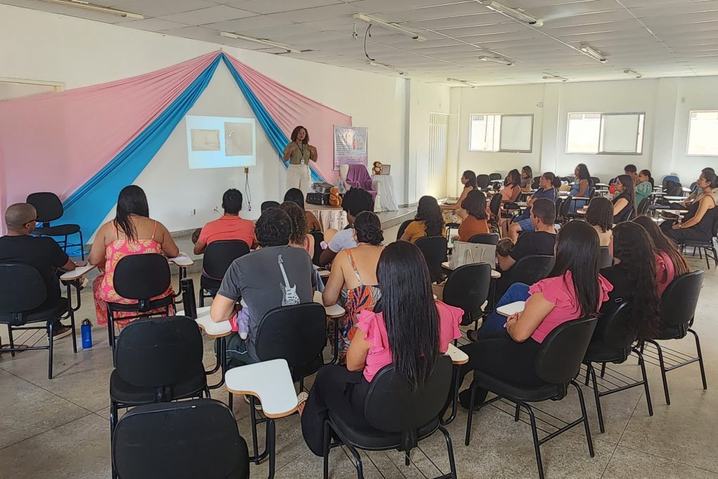 As modificações do corpo da mulher durante a gestação foi um dos temas abordados pela palestrante Graziele Santos Conceição, estudante do curso de Medicina da Universidade Estadual do Sudoeste da Bahia. Ela falou sobre a sua primeira participação no curso: “Eu me sinto muito gratificada em poder dividir um pouco do que estou aprendendo na universidade com os participantes do projeto. Eu fico muito feliz porque eu tenho uma paixão especial pelo Sistema Único de Saúde. E é ao mesmo tempo uma sensação de pertencimento e acolhimento em poder ajudar essas mulheres”.