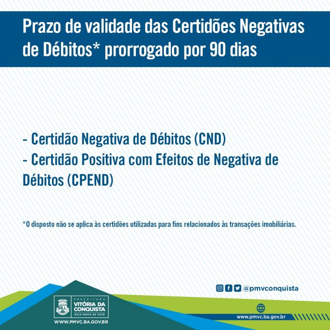 Em decorrência da pandemia relacionada ao novo coronavírus (Covid-19), a Prefeitura de Vitória da Conquista prorroga por 90 dias, a validade das Certidões Negativas de Débitos (CND) e Certidões Positivas com Efeitos de Negativas de Débitos (CPEND).