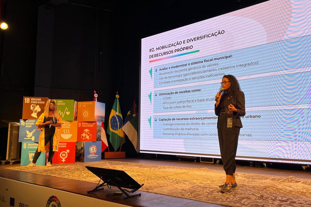 Já a representante da Frente Nacional de Prefeitas e Prefeitos (FNP), Júlia Melo, e a representante regional Lac no Fundo Mundial para Desenvolvimento das Cidades (FMDV), Gabriella Costa, no final da manhã, expuseram como os municípios podem obter recursos para implementar os objetivos. Entre os tópicos apresentados estão o levantamento da capacidade de pagamento do município, a atualização do tesouro nacional e as linhas de financiamento disponíveis.