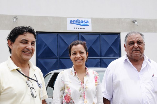 O gerente da Embasa, Álvaro Aguiar, a secretária de Infraestrutura, Débora Rocha, e o engenheiro Roberto Carvalho