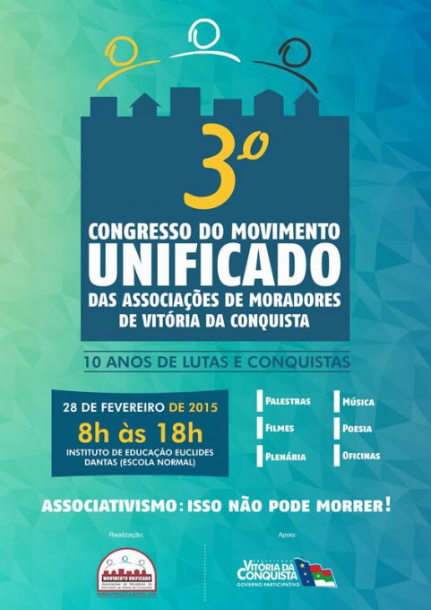 Cerca de 300 delegados das associações comunitárias existentes nas zonas urbana e rural de Vitória da Conquista participam, no próximo dia 28, do Congresso do Movimento Unificado das Associações de Moradores de Vitória da Conquista. O evento acontecerá no auditório do Instituto de Educação Euclides Dantas (Escola Normal), das 8h às 18h.