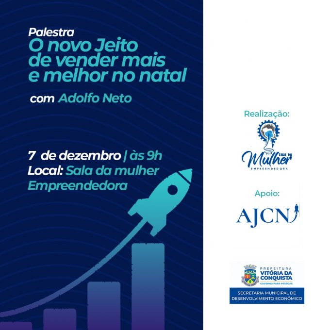 A Secretaria Municipal de Desenvolvimento Econômico (SMDE), com apoio da AJCN Consultoria e Assessoria em Marketing Digital e Vendas, promove na próxima quarta-feira (7) a palestra “O novo jeito de vender mais e melhor no Natal”. O evento acontece a partir das 9 da manhã, na Sala da Mulher Empreendedora.