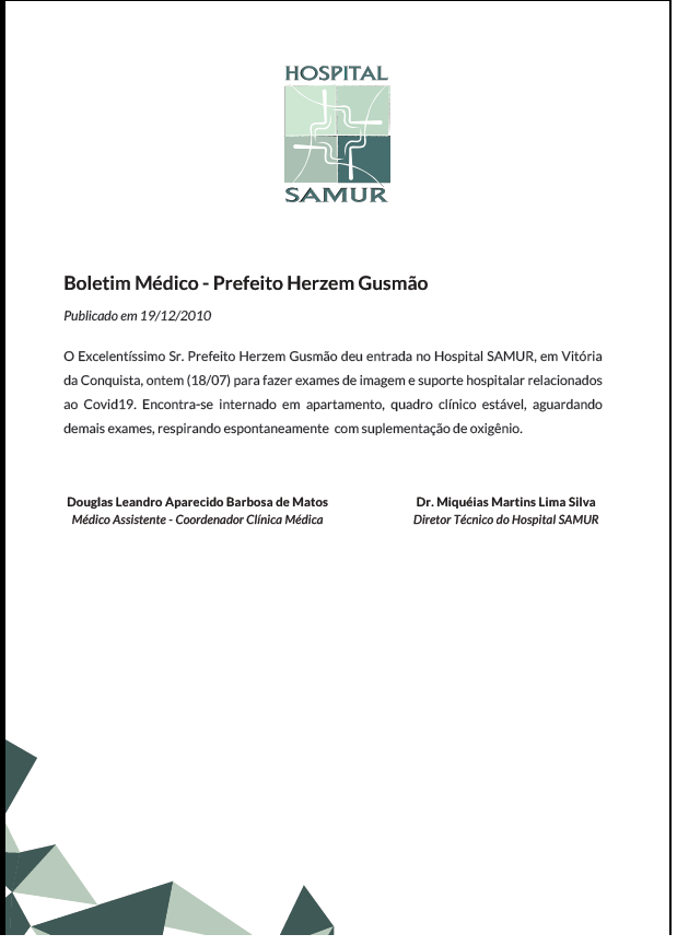 O prefeito Herzem Gusmão segue em tratamento na unidade Hospitalar do Samur. Confira o boletim médico:BOLETIM MÉDICO – 19 DE DEZEMBRO DE 2020